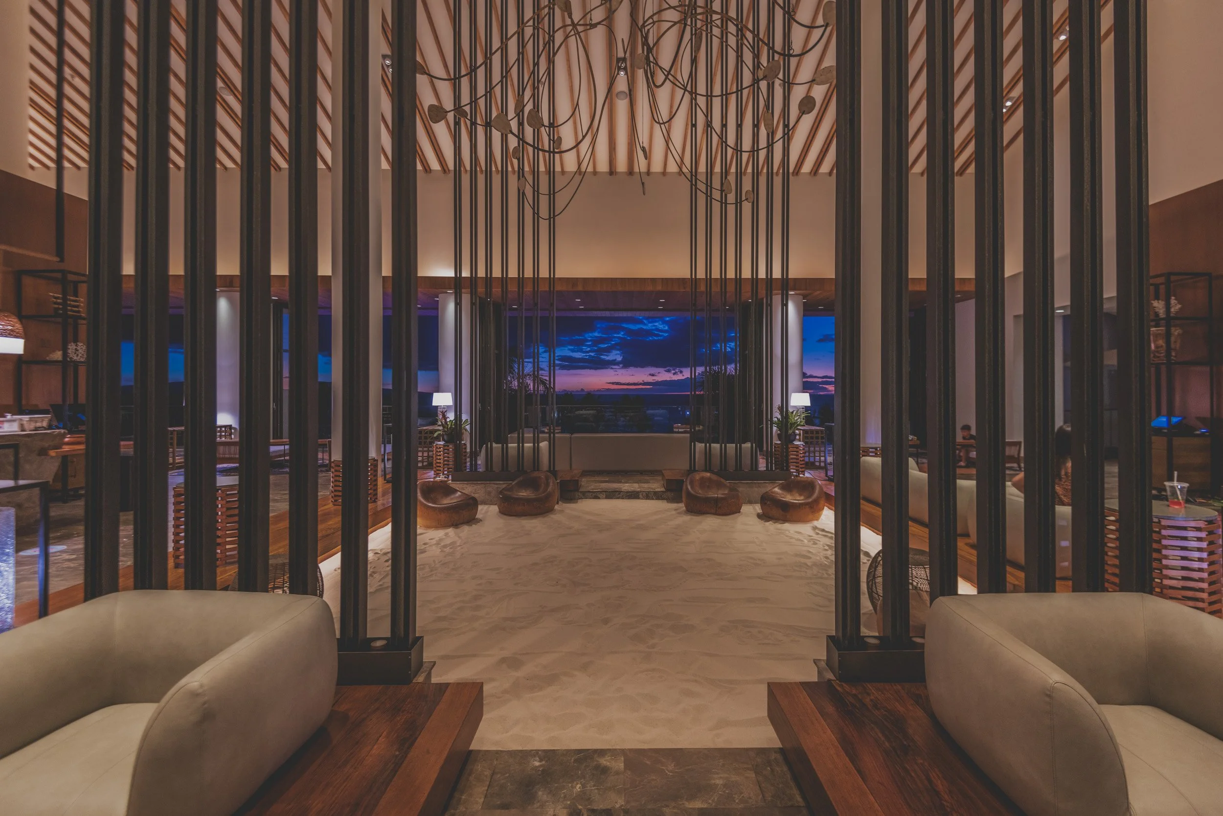 Lush, indigenous landscaping—including hibiscus, plumeria, and towering palms—softens the modern lines of the white-washed buildings. The entry experience is equally distinctive: you cross a bridge over a lantern-lit pool into an open-air lobby with a sandpit "check-in" area, immediately removing the barrier between indoor and outdoor living. This intentional layout is factual and serves to immerse you in the island's natural elements from the second you arrive.