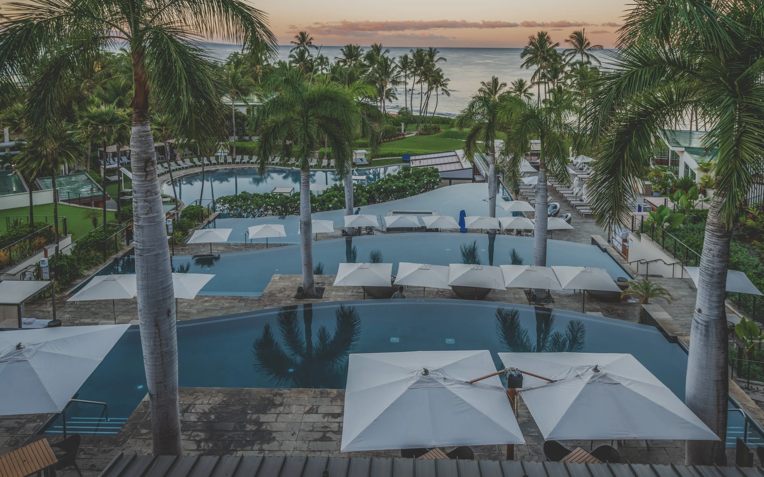 The grounds of the Andaz Maui are truly unique, designed by the Rockwell Group to orient every guest toward the ocean. The most striking architectural feature is the series of three cascading infinity pools that descend like a waterfall toward the beach. This tiered design creates a stunning visual "mirror" of the Pacific, ensuring that no matter where you are on the pool deck, the horizon remains your primary focal point.
