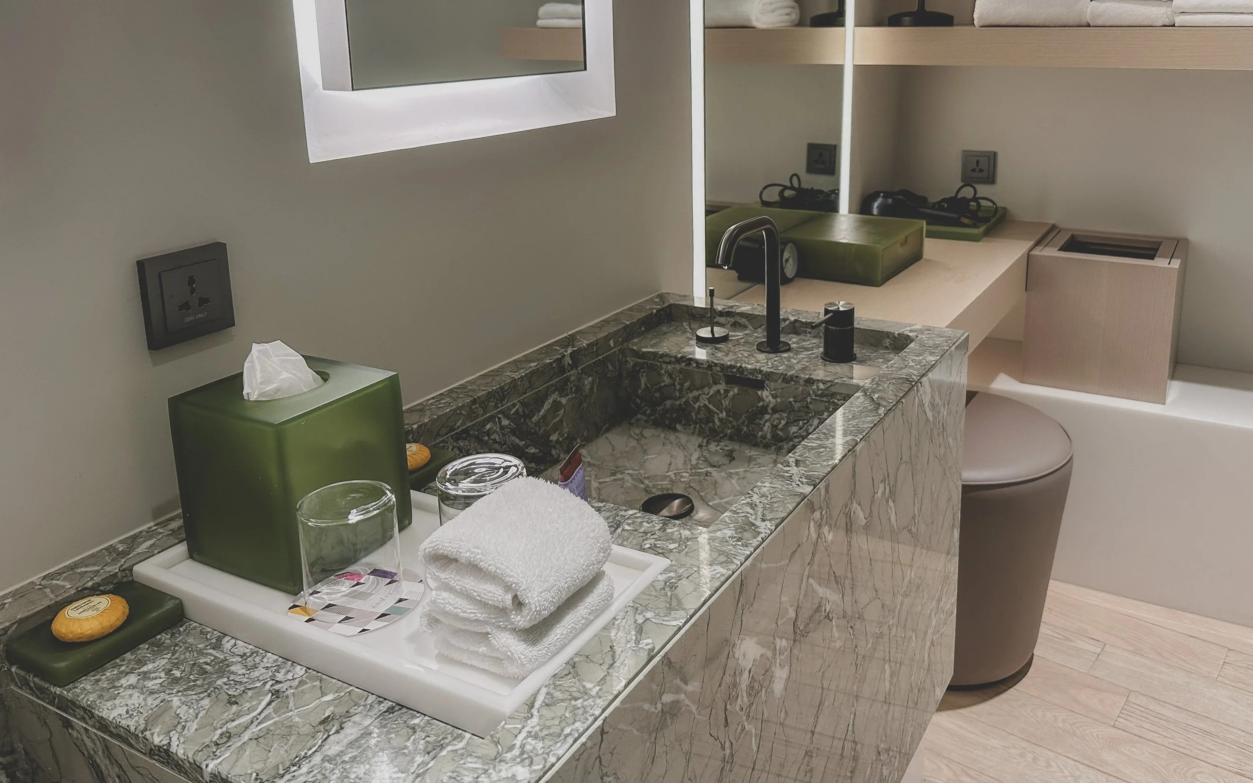 The bathroom amenities provided are also quite unique, featuring products from the esteemed brand, Christophe Laudamiel. Honestly, the bathroom has become one of my favorite areas of the entire room; with its unique design and thoughtful layout, it serves as a wonderful place to unwind and relax after an exhausting day.