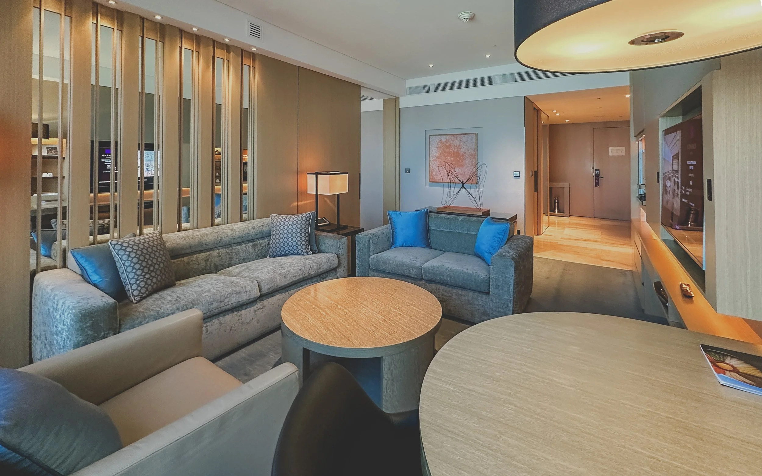 Upon entering the Grand King Executive Suite at Conrad Seoul, the scale and panorama immediately command attention. The suite’s expansive living area opens onto sweeping views of the Han River and the Seoul skyline, framed by four oversized windows that deliver an uninterrupted 180-degree vista of the city’s most recognisable landmarks. The arrival sequence is thoughtful and proportionate to the suite’s size: a discreet powder room sits to the right of the entrance, while a short walk down the foyer reveals an exceptionally large two-door walk-in closet — large enough to be considered a separate room. This generous storage space provided ample capacity for our luggage and links directly between the living room and the suite’s substantial bathroom.