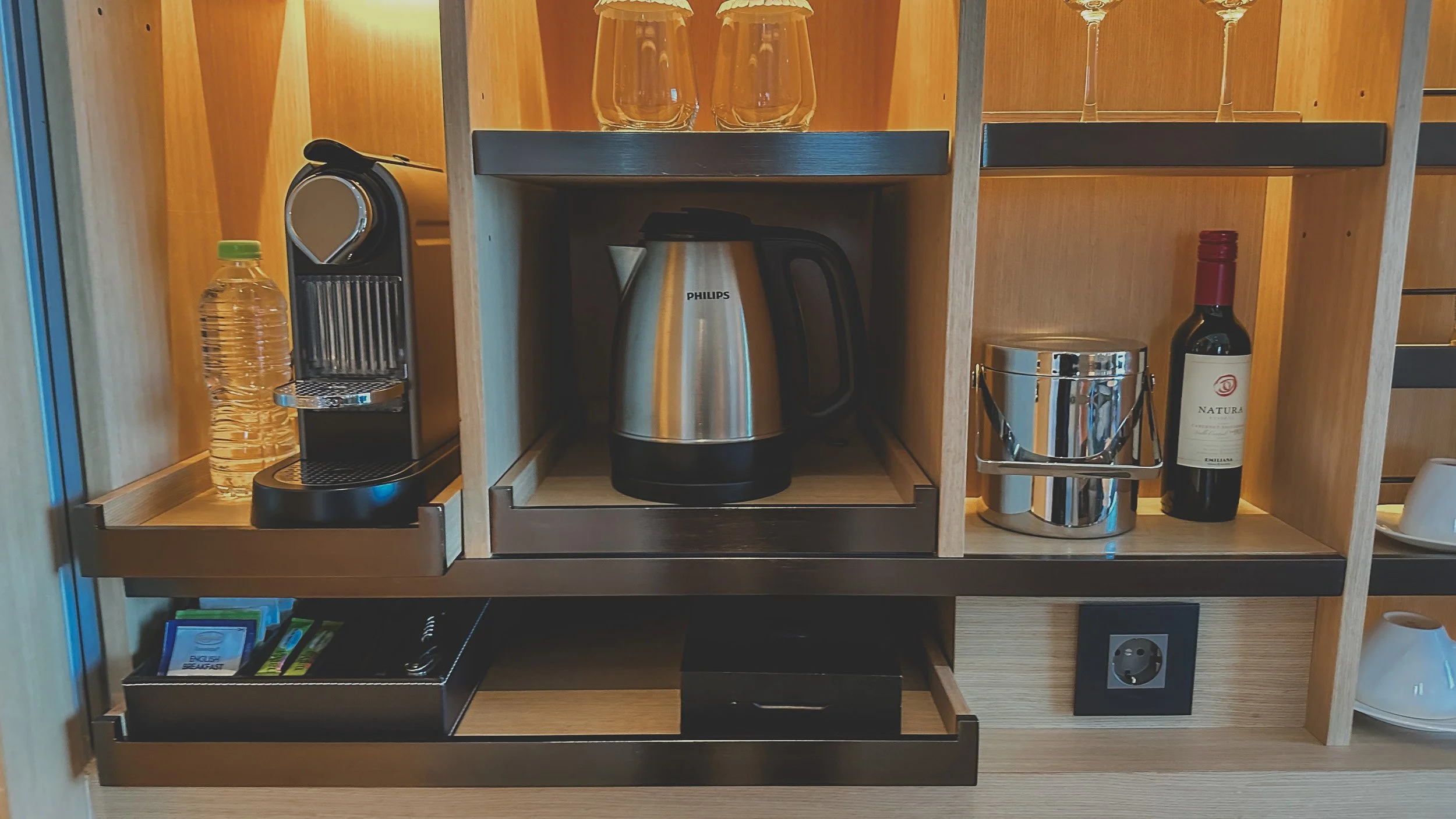 At roughly 96 square metres (1,033 square feet), the Grand King Executive is one of the largest suites I have ever reviewed. The bedroom is anchored by a generously proportioned king bed complemented by a comfortable daybed positioned to take full advantage of the views — it proved ideal for daytime relaxation. The bed itself offered excellent comfort, supported by a selection of feather pillows that made for restorative sleep and helped alleviate jet lag.Technological and comfort features are comprehensive and intuitively distributed: dual control panels in both the living room and bedroom manage lighting and climate, with multiple lighting modes available in each zone to tailor the ambiance. The suite also includes reliable high-speed Wi‑Fi, multiple televisions, a Bose sound system and a Nespresso machine, creating a refined environment for work or unwinding.
