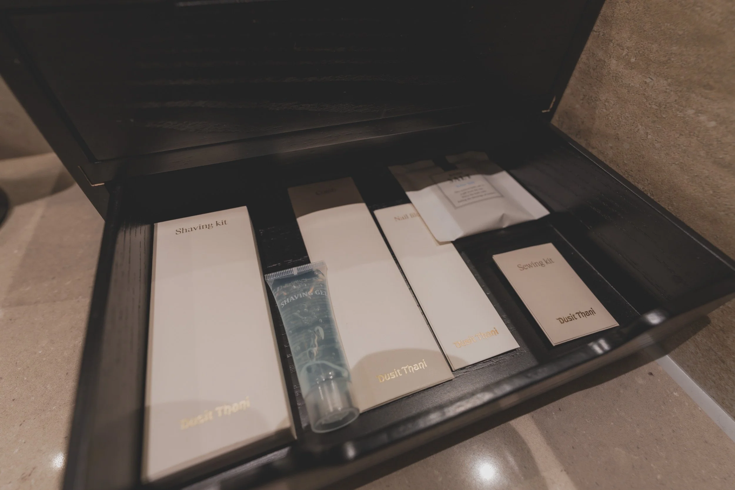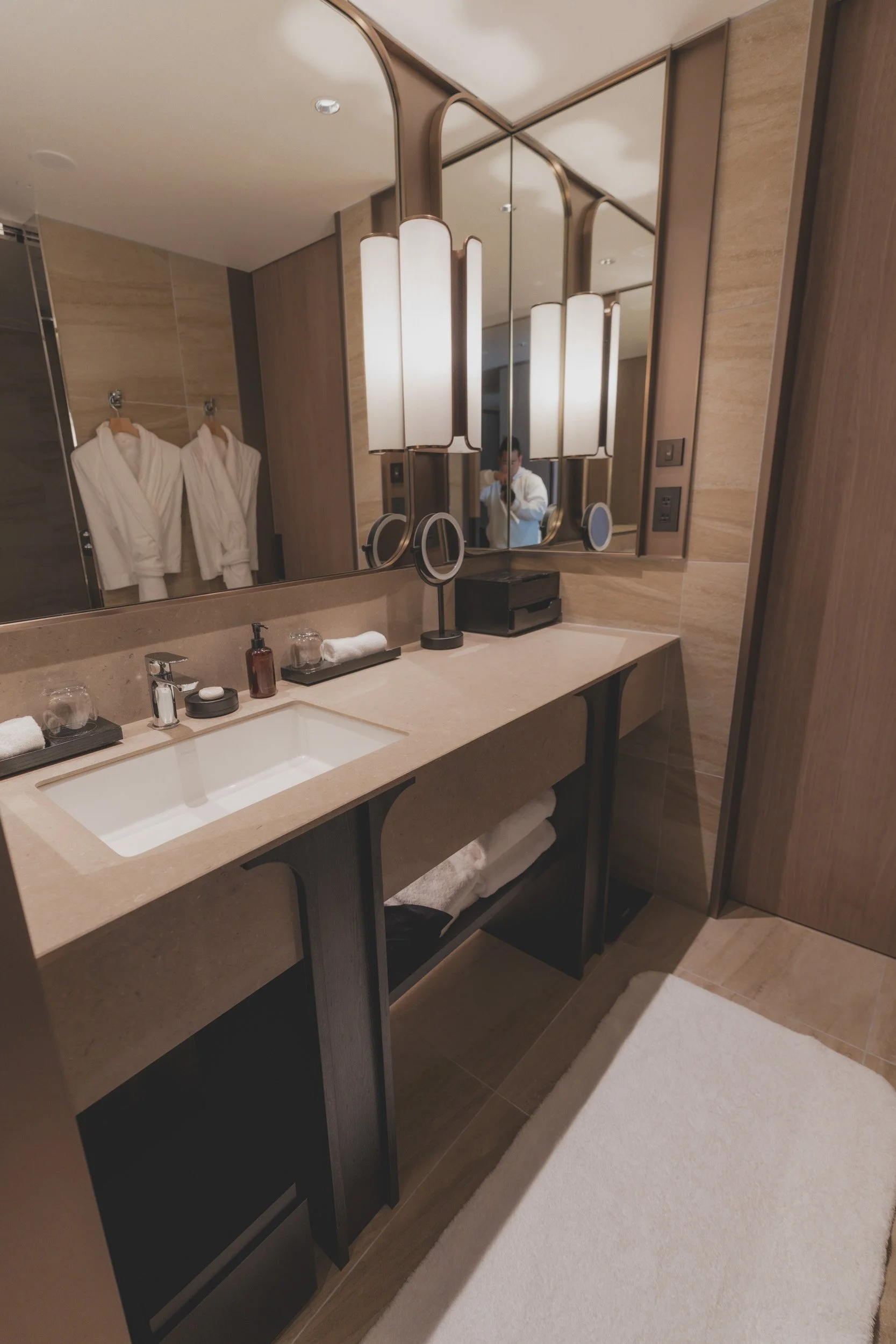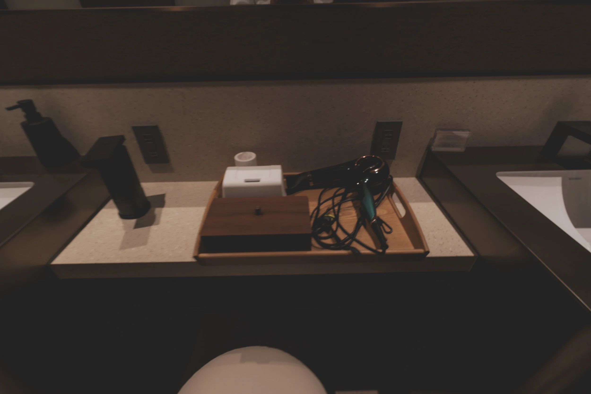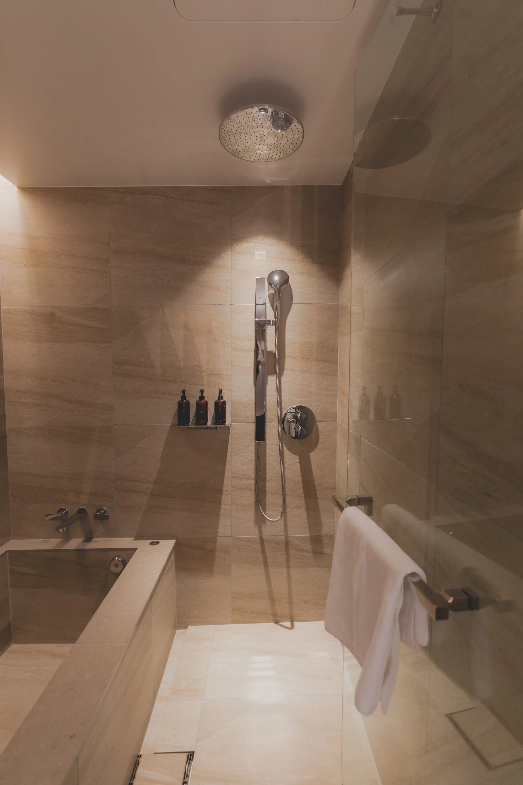 If the bedroom is about serenity, the bathroom is where the Dusit Thani leans into pure indulgence. Clad in sleek stone and warm wood, the space features a deep, square soaking bathtub that pays homage to the Japanese ofuro tradition, perfectly paired with a separate rainfall shower. The water pressure is exemplary—a detail often overlooked by lesser hotels but critical for a luxury reviewer—and the drainage is silent and efficient. It is a private sanctuary designed for the ritual of washing away the day's travel fatigue. The bathroom amenities were more in-house and utilized the brand Devarana Wellness for its body and hair wash. Lovely scent, again like the hotel - underrated.