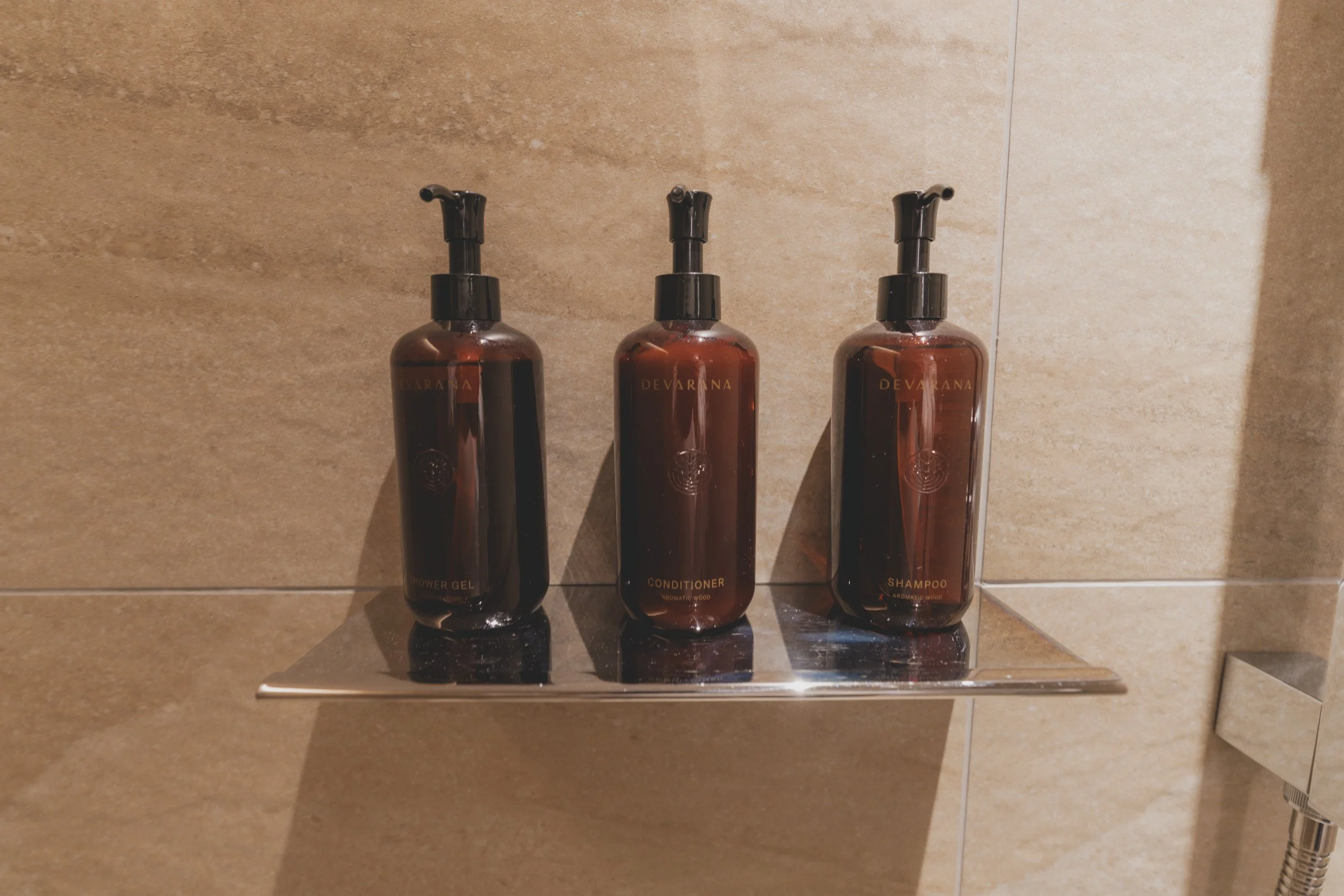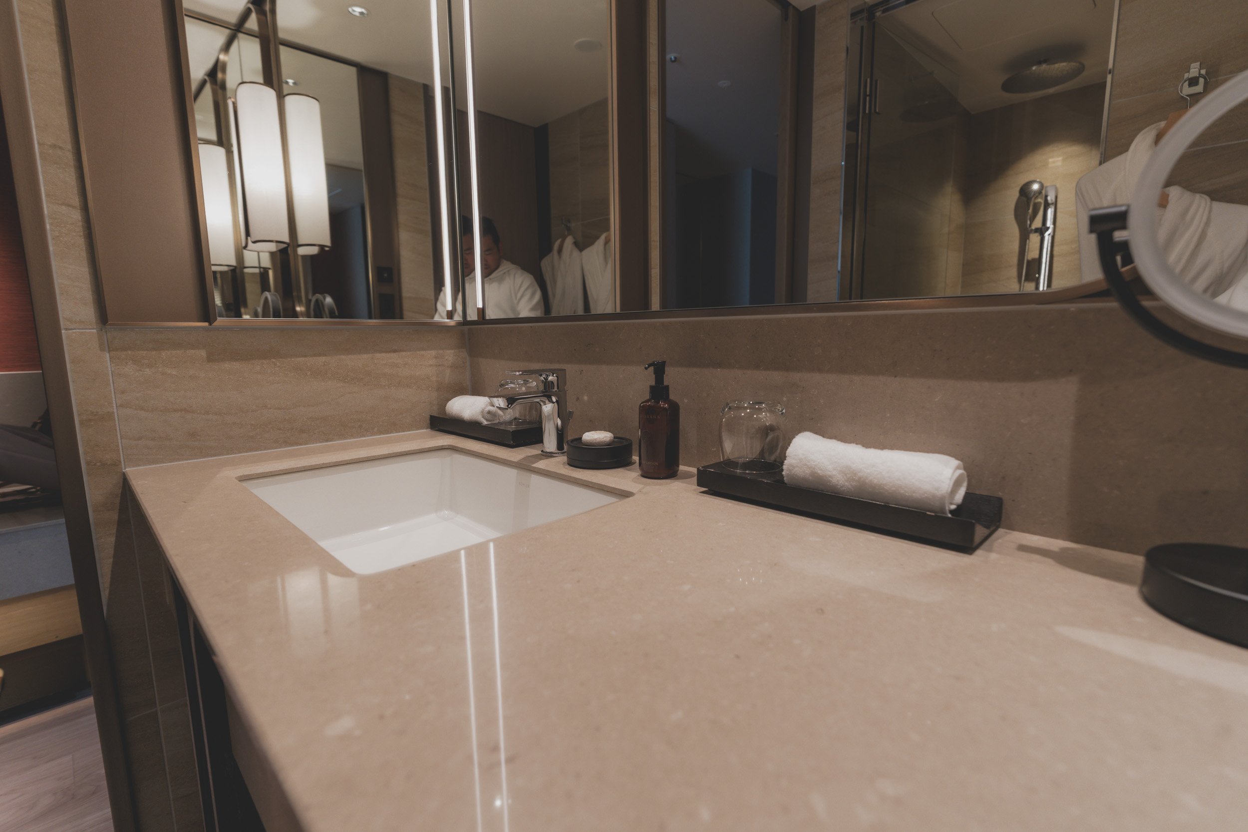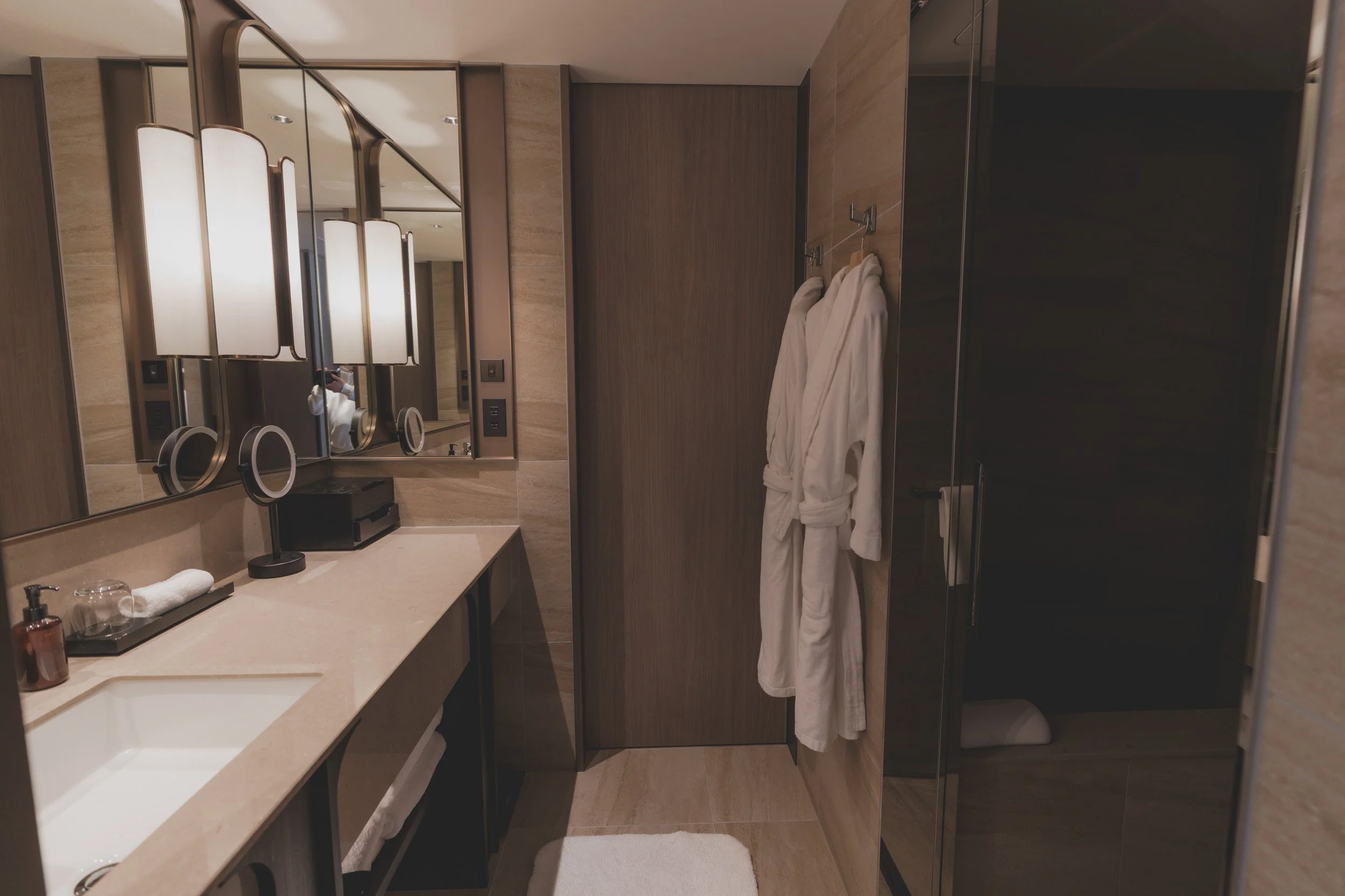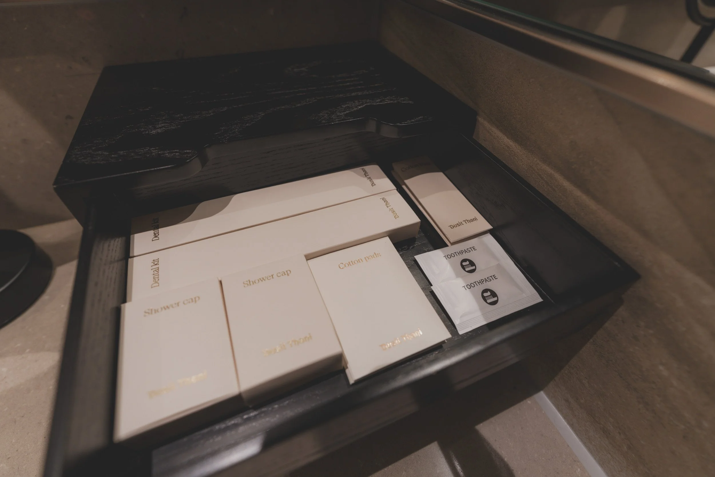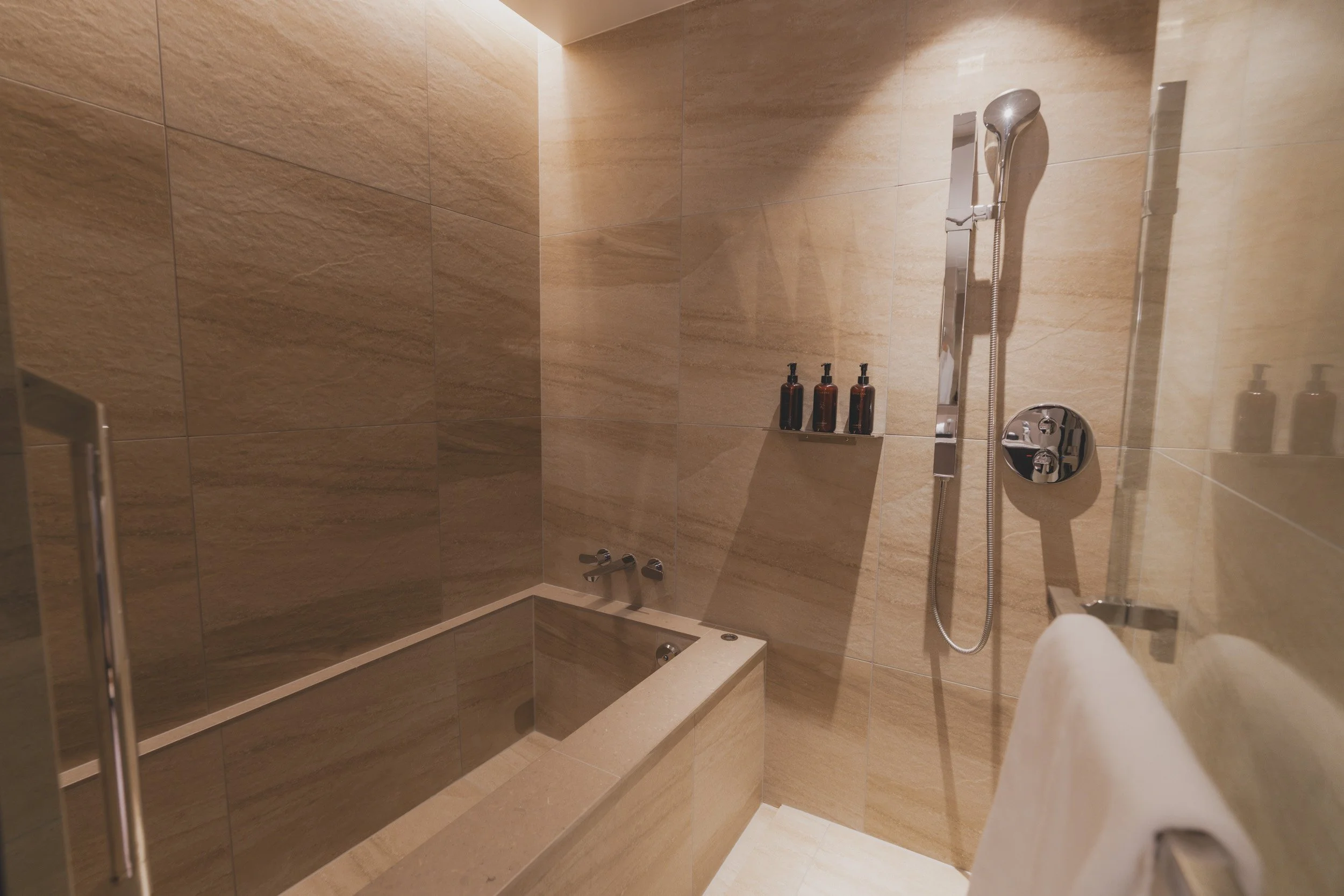 If the bedroom is about serenity, the bathroom is where the Dusit Thani leans into pure indulgence. Clad in sleek stone and warm wood, the space features a deep, square soaking bathtub that pays homage to the Japanese ofuro tradition, perfectly paired with a separate rainfall shower. The water pressure is exemplary—a detail often overlooked by lesser hotels but critical for a luxury reviewer—and the drainage is silent and efficient. It is a private sanctuary designed for the ritual of washing away the day's travel fatigue. The bathroom amenities were more in-house and utilized the brand Devarana Wellness for its body and hair wash. Lovely scent, again like the hotel - underrated.
