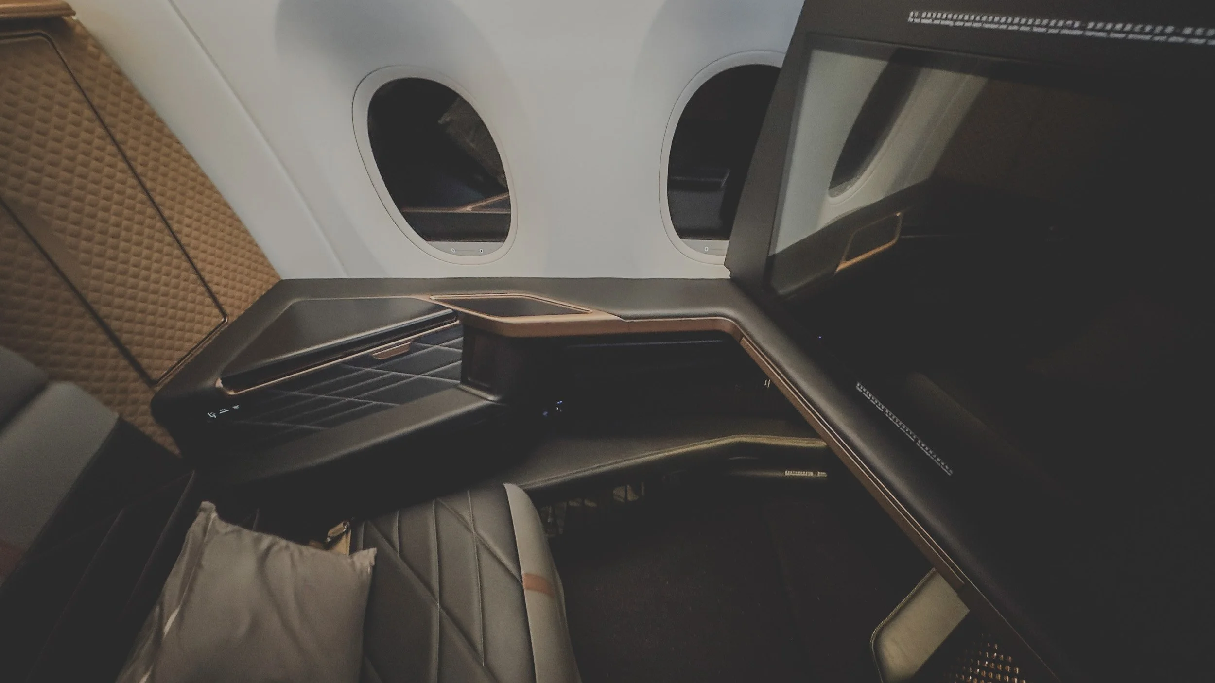 Let’s deep dive into the seat a bit more: each seat has quite a large counter to the side of it, with an elegant lamp that has multiple dimming functions. There’s a button on the counter that you can push to expose a fairly shallow storage compartment, where you could place items like your passport and phone. Furthermore, a large enclosed storage compartment contains a mirror, a hook for headphones, the entertainment controller, and the headphone jack.