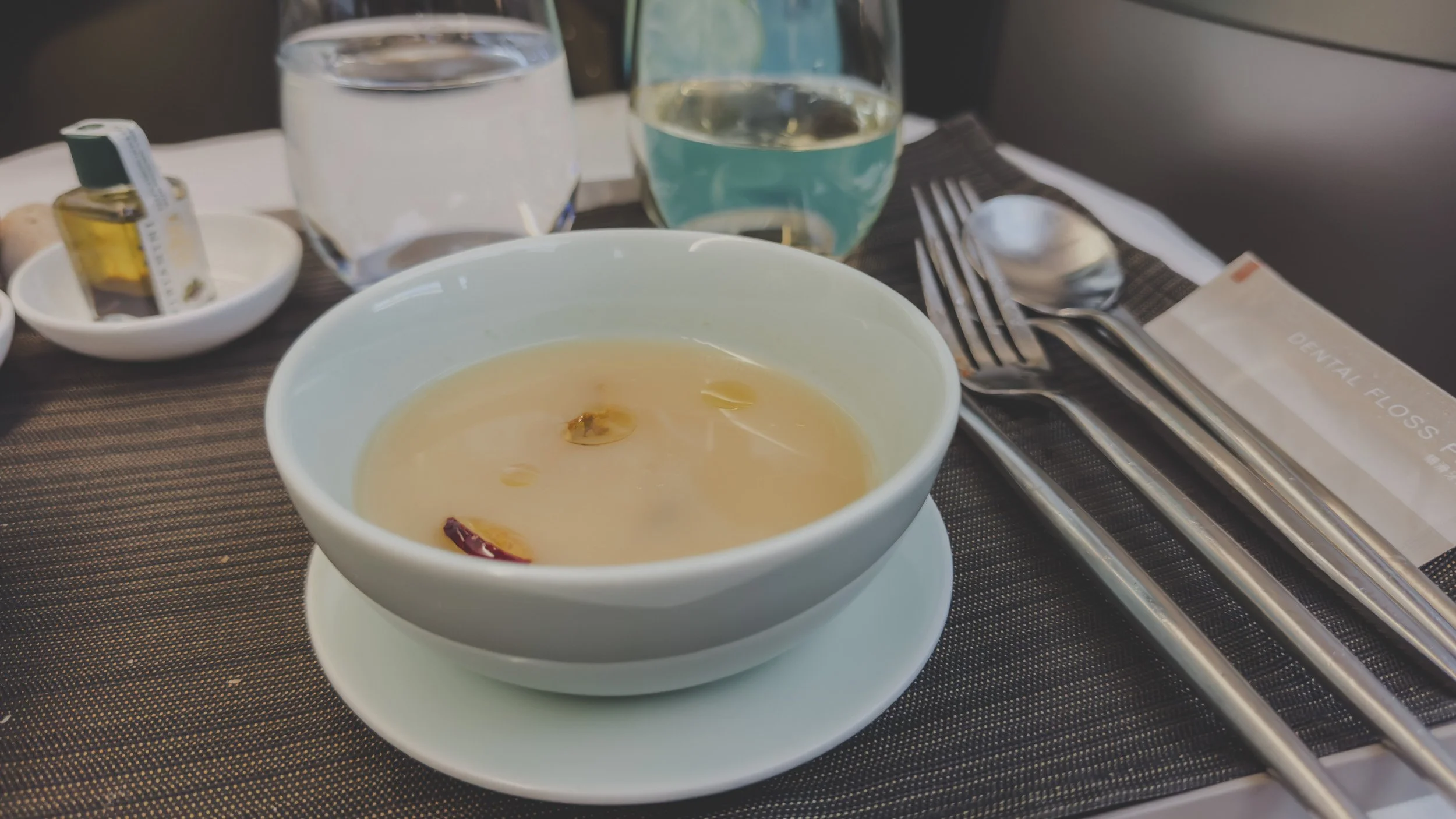 Printed menus were at every business-class seat, and our flight attendant took the time to walk me through the options for both dinner and breakfast. It was a lovely service touch that I haven't found on many international business-class flights. We were also offered pre-departure drinks immediately. The airline doesn’t offer pre-departure drinks of choice, but rather offers a signature drink on each flight. On this flight it was a honey, peppermint, cucumber, and passionfruit juice, served with a warm towel. I downed that drink immediately.