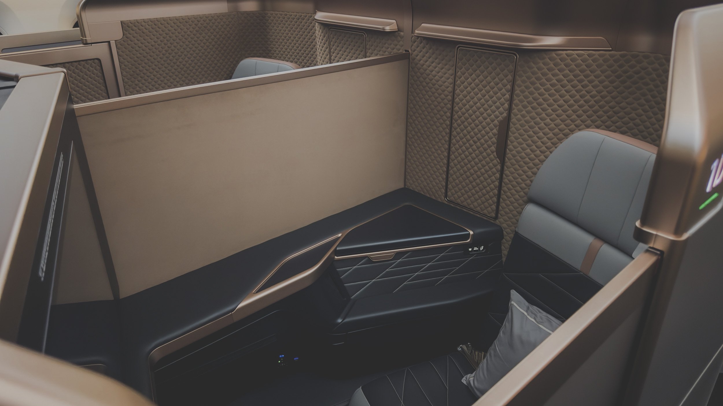 The First Class experience on the STARLUX A350-1000 represents the pinnacle of the airline’s "Galactic" luxury, featuring a boutique four-seat cabin in a 1-2-1 configuration. These suites are a significant evolution of the Business Class product, boasting 60-inch high privacy doors—nearly a foot taller than those in Business—and a massive 32-inch 4K screen that offers a cinema-like entertainment experience. The seat itself is a marvel of ergonomics, finished in rich quilted leather with rose gold accents, and includes an integrated personal wardrobe, a private minibar, and a dedicated luggage locker, ensuring every essential is within arm's reach while maintaining a clean, residential aesthetic.