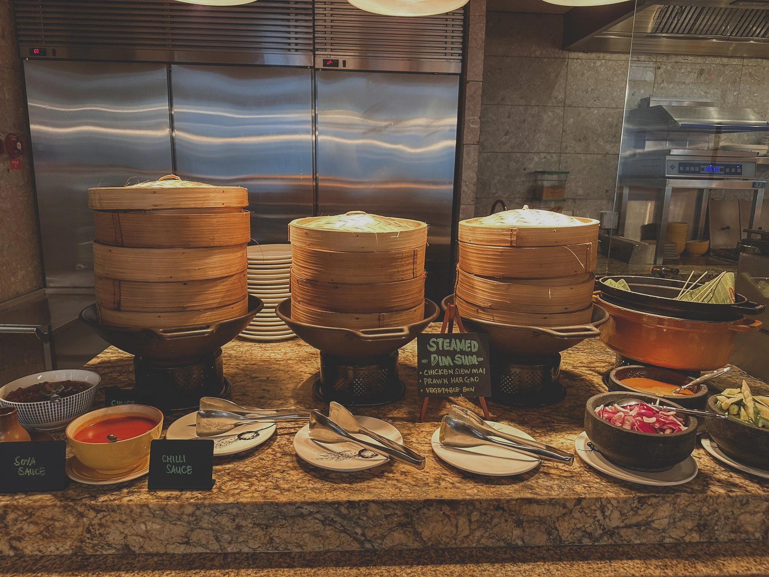 Breakfast is served at Alley on 25, a sprawling culinary hub that mimics a traditional Singaporean street market. The spread is incredibly diverse, offering everything from made-to-order laksa and dim sum to western classics like eggs benedict and freshly baked pastries. The multiple "shophouse" stations allow guests to sample a wide array of local flavors in a casual, airy environment that overlooks the city.