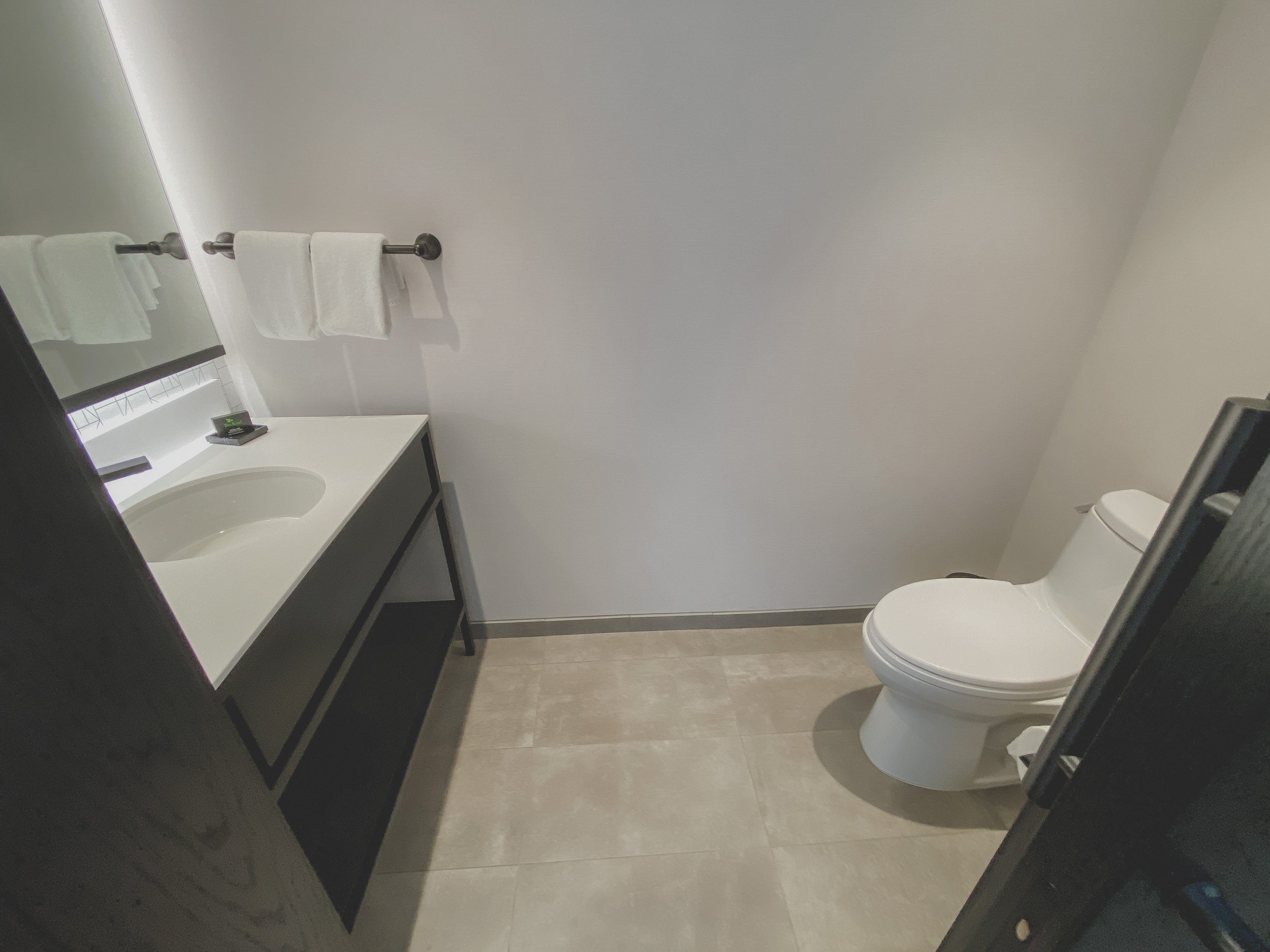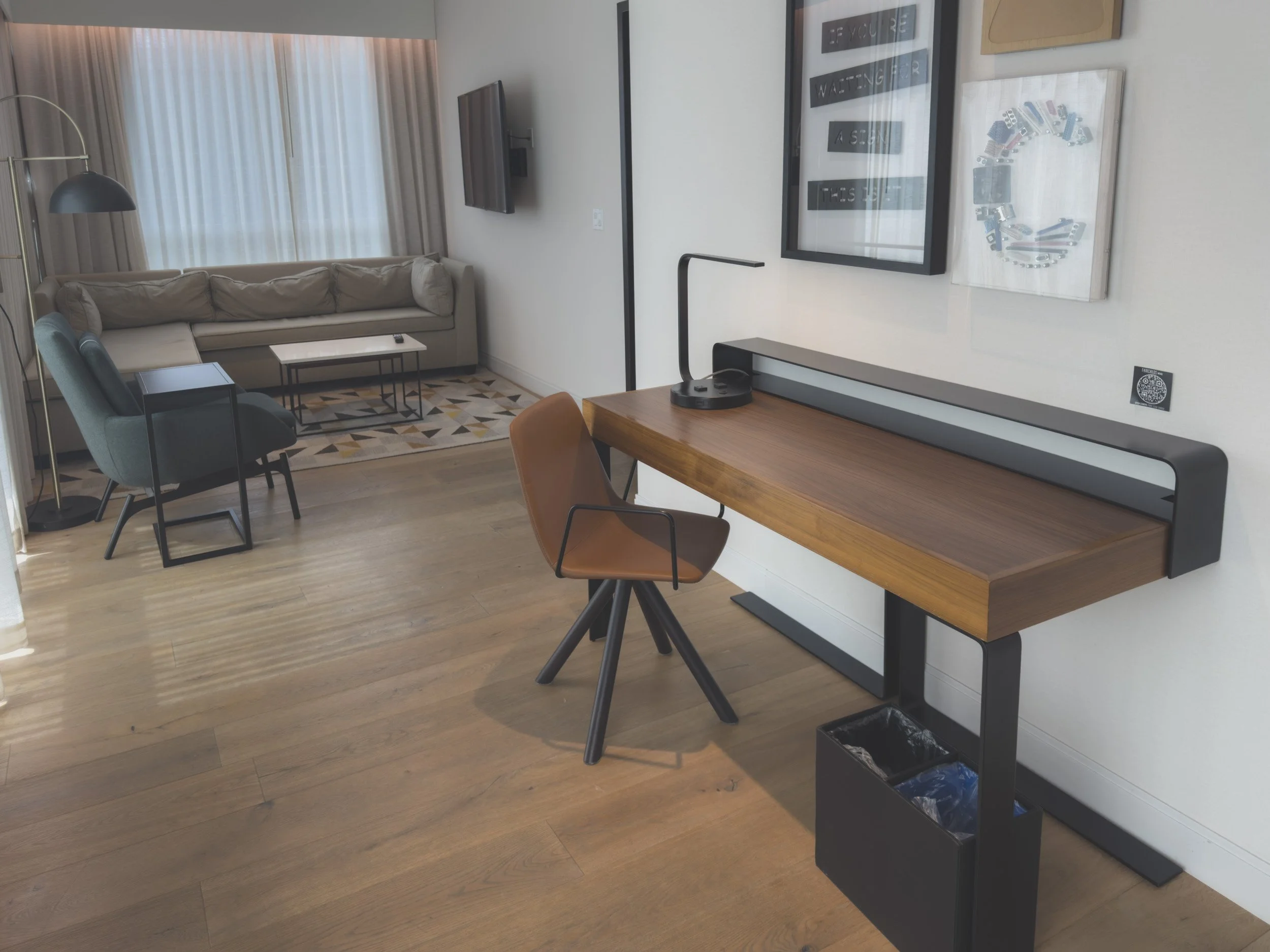 The bathroom continues the hotel’s sleek design language, offering a refreshing, spa-inspired retreat. It features a spacious walk-in shower with a rainfall head, complemented by high-end, eco-friendly BeeKind bath amenities that provide a bright, citrusy start to the morning. With a large backlit vanity and plush towels, the layout is optimized for efficiency and comfort. This room serves as a perfect hub for travelers who value a streamlined, tech-forward environment without sacrificing the premium touches of a boutique hotel.
