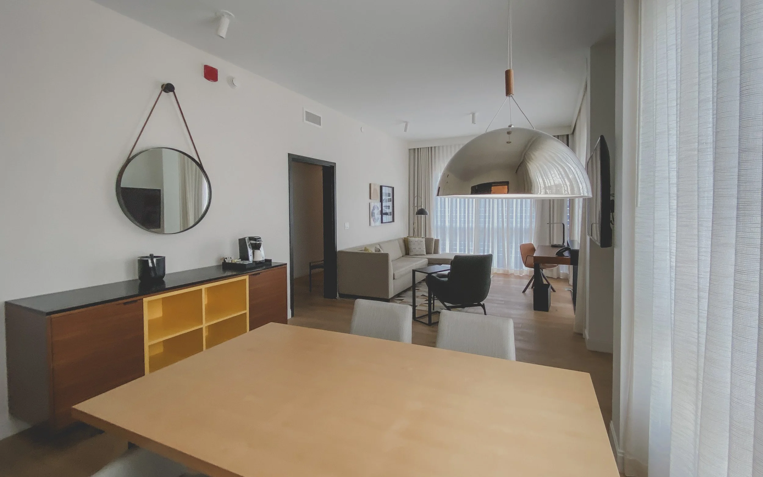 The living room serves as a versatile hub, equipped with a large sleeper sofa, a dedicated dining or meeting table, and a 55-inch flat-screen TV. For the business traveler, the suite is a tech-forward sanctuary, offering high-speed Wi-Fi, conveniently placed USB charging ports, and a Drybar buttercup blow-dryer for quick morning prep. A curated wet bar area—complete with a Keurig coffee maker and a mini-fridge—ensures you have the essentials at hand for late-night work sessions or early morning starts.