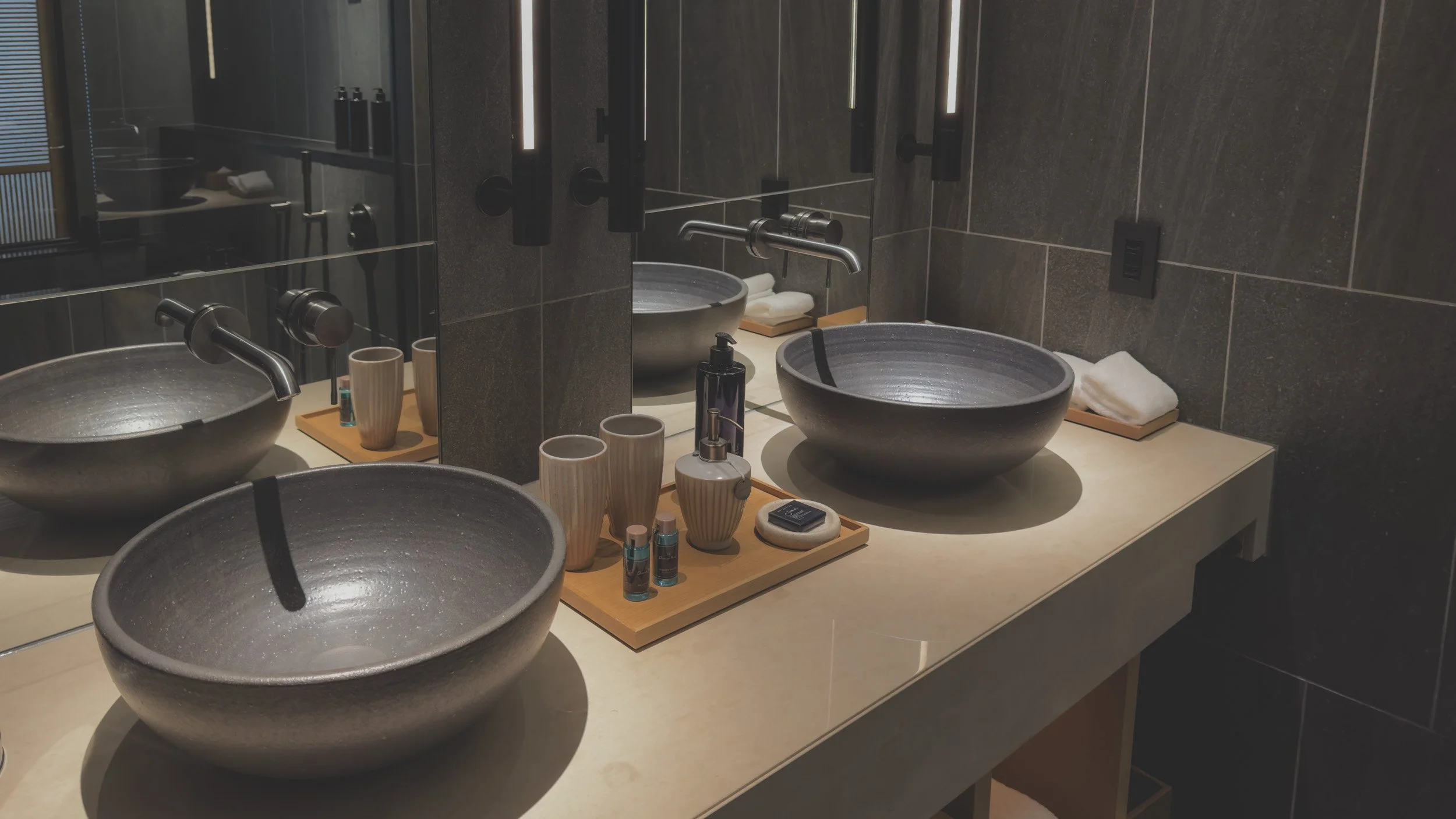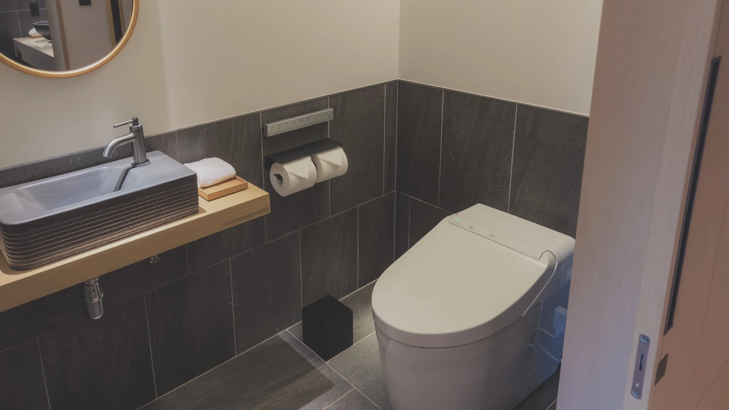 The bathrooms in the Premier Rooms (specifically the Premier Onsen category) at ROKU KYOTO are the definitive highlight of the resort experience, blending minimalist Japanese aesthetics with total sensory indulgence. The centerpiece is a massive, deep-soaking tub carved from smooth stone, which is continuously fed by natural volcanic thermal waters piped directly from the earth. Unlike standard hotel tubs, these are designed for "kakeyu" (the ritual of pouring water over oneself) and are set against floor-to-ceiling glass walls that overlook a private, tranquil garden or the forested slopes of the Takagamine mountains.