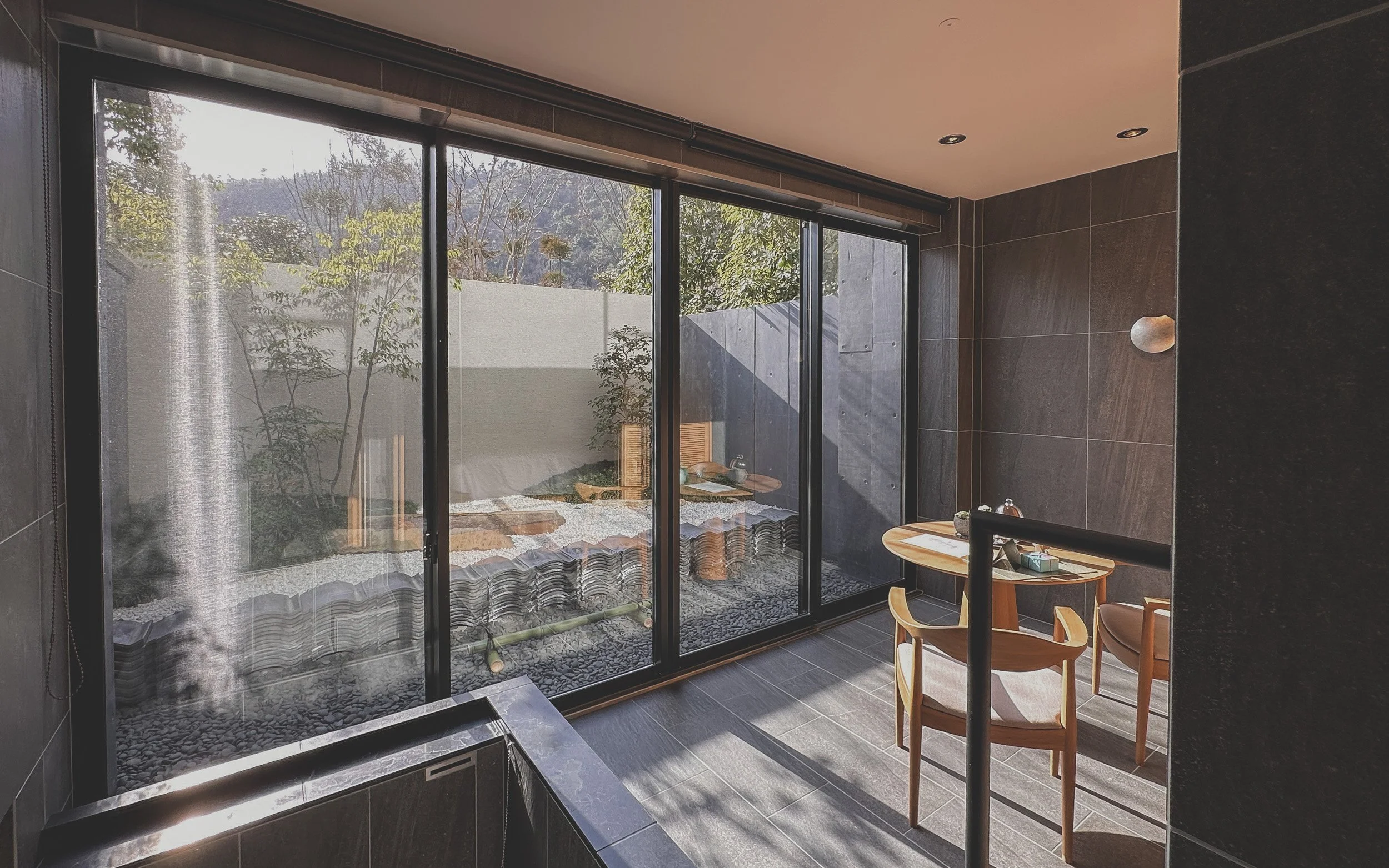 Once you head into the garden patio, you’re welcomed with a picturesque sight of the zen garden along with the stone onsen to your left. The onsen sits in there with floor-to-ceiling windows that can be opened to bring the Kyoto air in. This onsen pours natural hot spring water directly from the source, and was definitely one of the my favorite moments in this particular stay. While the other rooms have a similar layout with the onsen being based in the bathroom itself, the element of having the onsen right next to the garden is the reason why I aimed for this particular room to begin with.