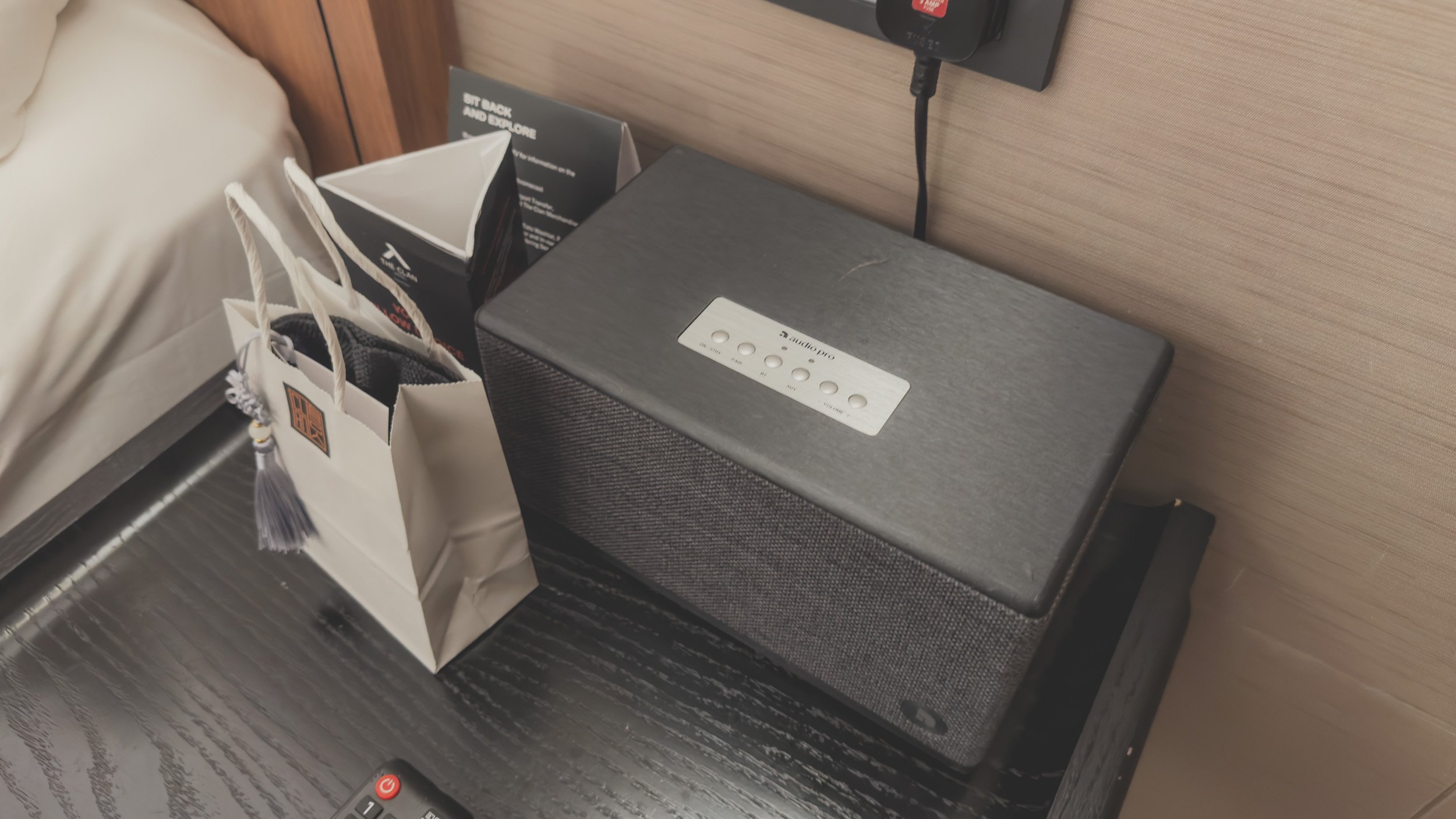 This bed is awesome. The King-sized bed was firm and extremely comfortable, and the pillows were simply fantastic. The bedsheets do a good job of retaining heat, allowing me to set the air conditioning to a pleasant temperature at all times. Both bedsides have a full range of lighting controls, as well as one USB charging port and one universal power outlet. Do note that one of the power outlets is occupied by an Audio Pro sound system, which is bluetooth friendly. Two universal power outlets and USB ports were built into the top left of the desk, as well as an ethernet port.