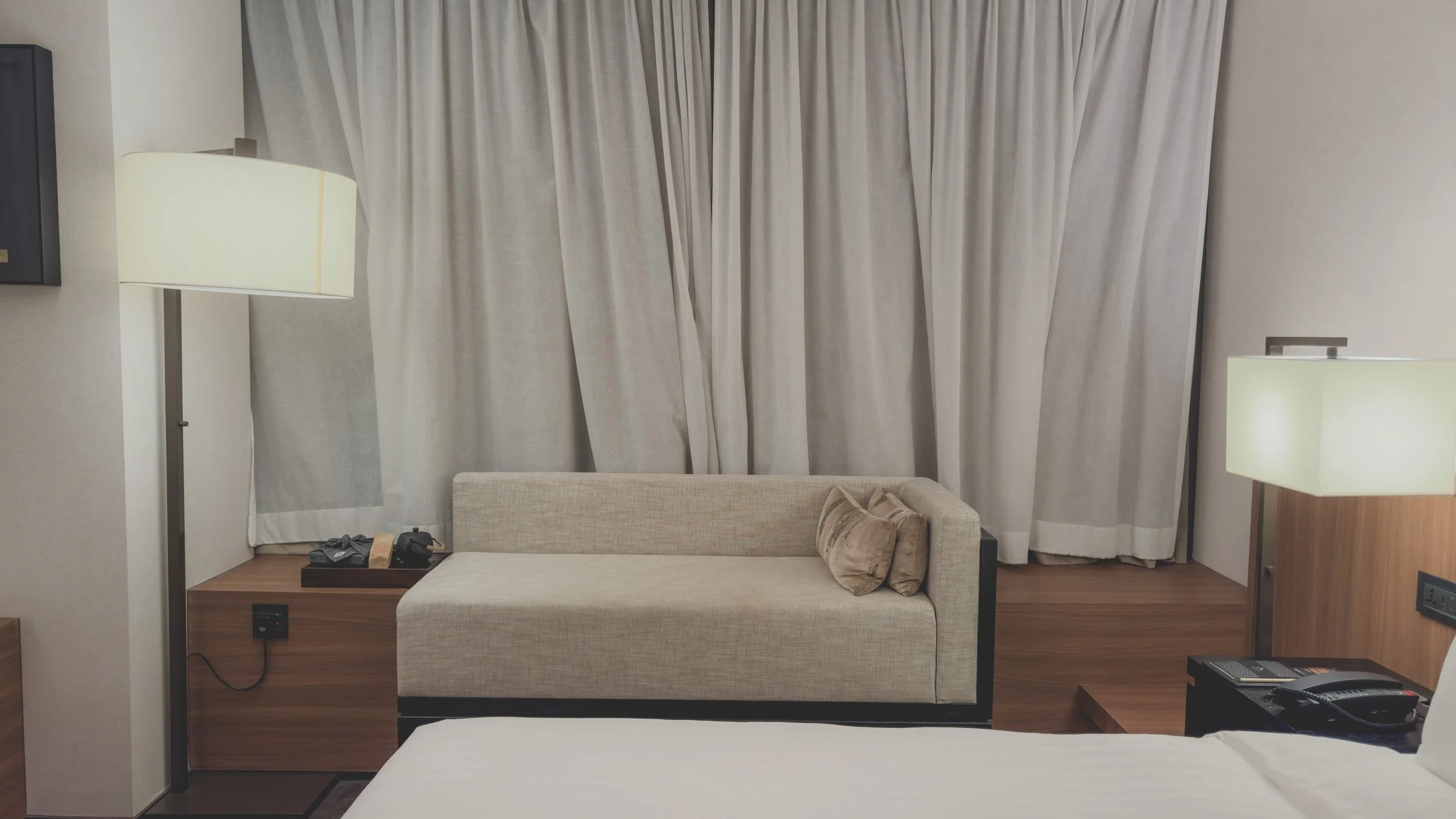 Premier Rooms are located at the corners of each floor and have wraparound views of the neighboring districts. They are only available in a King/Queen configuration, so those who want twin beds will need to pick a Deluxe Room instead (all rooms take a maximum of two people). The Premier Room strikes a decidedly modern business tone, but the oriental vibes and elements make it more unique. The décor plays it safe with a soothing color palette of muted tones and warm lighting, and the L-shaped layout provides extra space for lounging by the windows. The window bay opposite the bed features a long settee that runs the full length, interrupted only by a work desk, which featured its own electronic outlet panel.