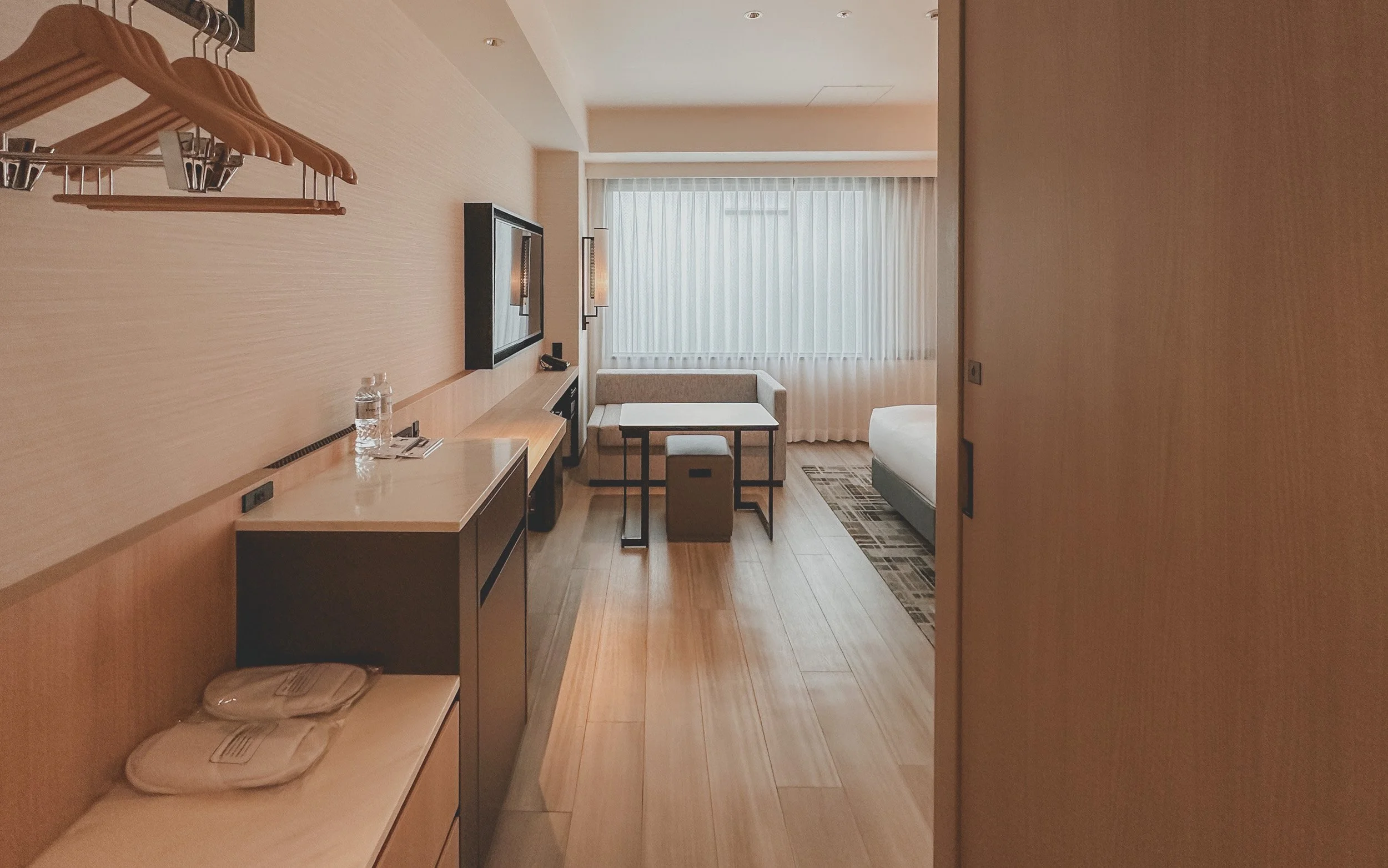 The 1 King Bed Premium room may be small, but the design showcases spatial intelligence. Spanning approximately 35 square meters (376 sq. ft.), it is the largest king configuration in the hotel. While "small" by American standards, the size works exceptionally well in the Kyoto context; the layout is divided into a dedicated sleeping zone and a compact, high-performance workspace. The aesthetic is "warm-industrial," featuring ample plain wood, large windows that flood the space with light, and thoughtful Japanese accents like kimono-inspired tapestries.