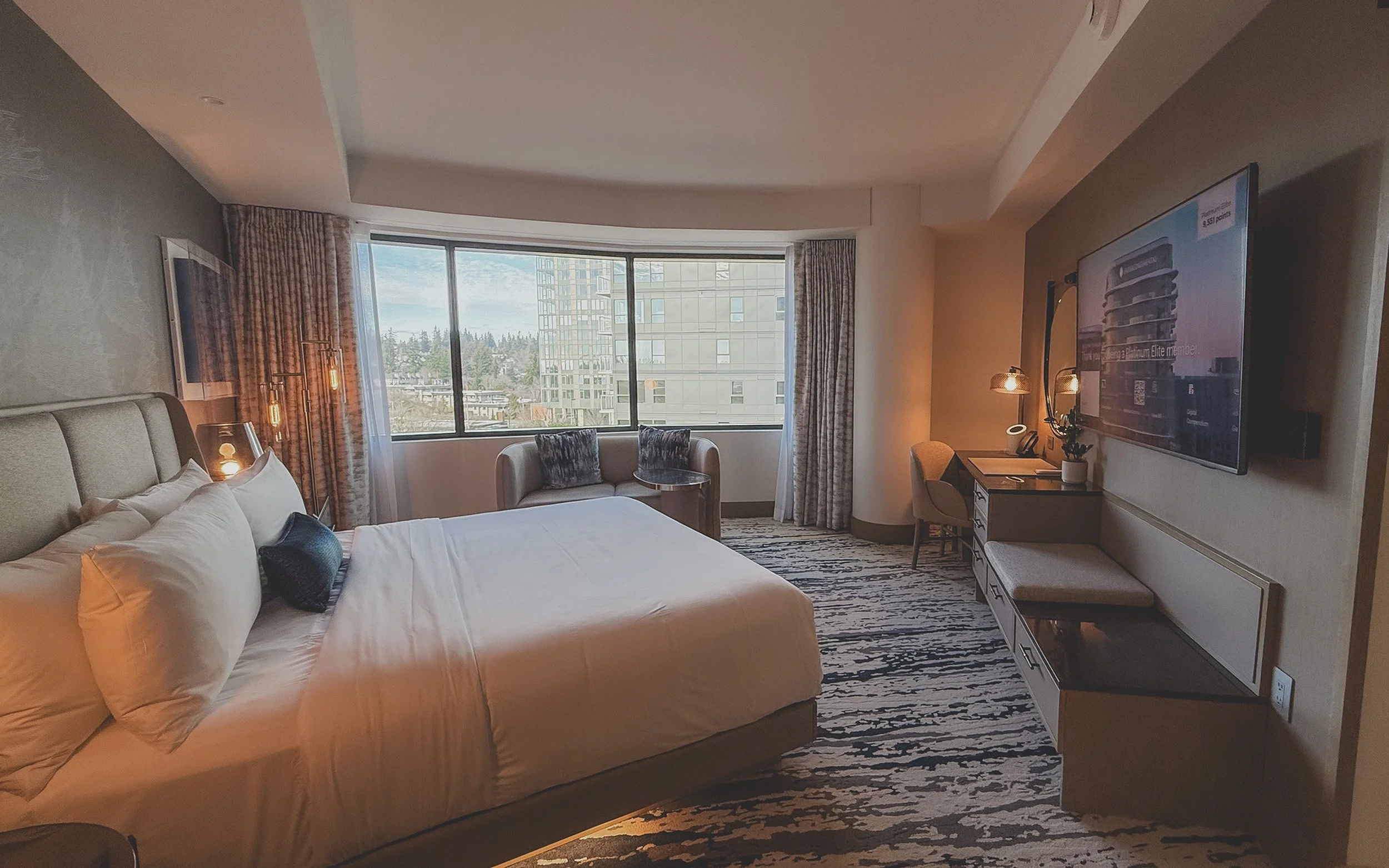 The King Premium Corner room feels quite spacious from the very moment you step inside. Measuring approximately 450 square feet, these premium rooms offer ample space for both relaxation and productivity, thoughtfully designed with abundant charging ports that include a range of USB-A, USB-C options, and traditional outlets. The impressive floor-to-ceiling windows are a defining feature of these rooms, providing captivating views of the surrounding city skyline, which includes Bellevue's burgeoning tech hub, as well as the picturesque Olympic Mountains that can be seen in the distance. Given that the hotel only spans 11 floors, I wouldn’t say that the views here are particularly dramatic, but what truly makes up for it is the exceptional quality and comfort of the rooms provided here.