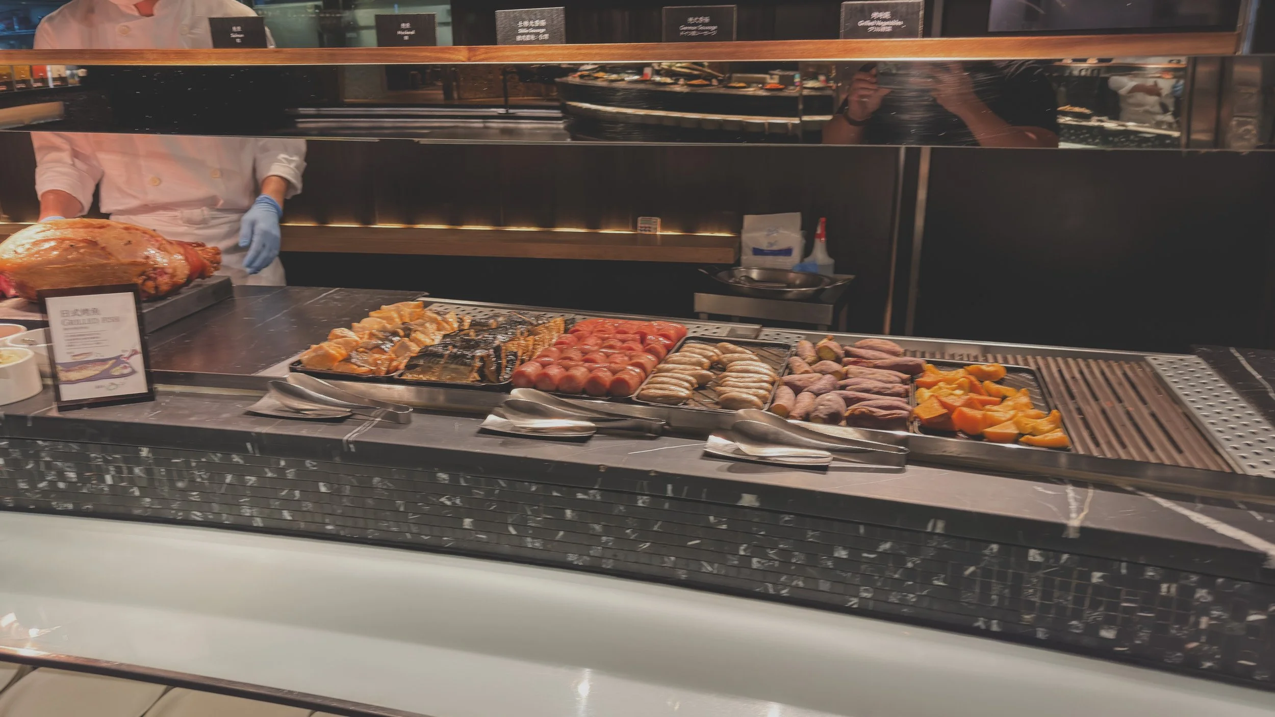 Guests are treated to an international feast with options like freshly baked pastries, artisanal bread, personalized omelets, and a ton of western selections. For those seeking a taste of Taiwan, local specialties such as steamed dumplings, egg pancakes, turnip cakes and savory porridge are a delightful highlight. Fresh tropical fruits add a burst of color, while health-conscious diners can indulge in organic selections like cereals, yogurt, and fresh fruit juices. Want Japanese? There’s an udon station, salmon and mackerel and more. There’s even a growth of Korean food here, such as made-to-order kimbap and more!