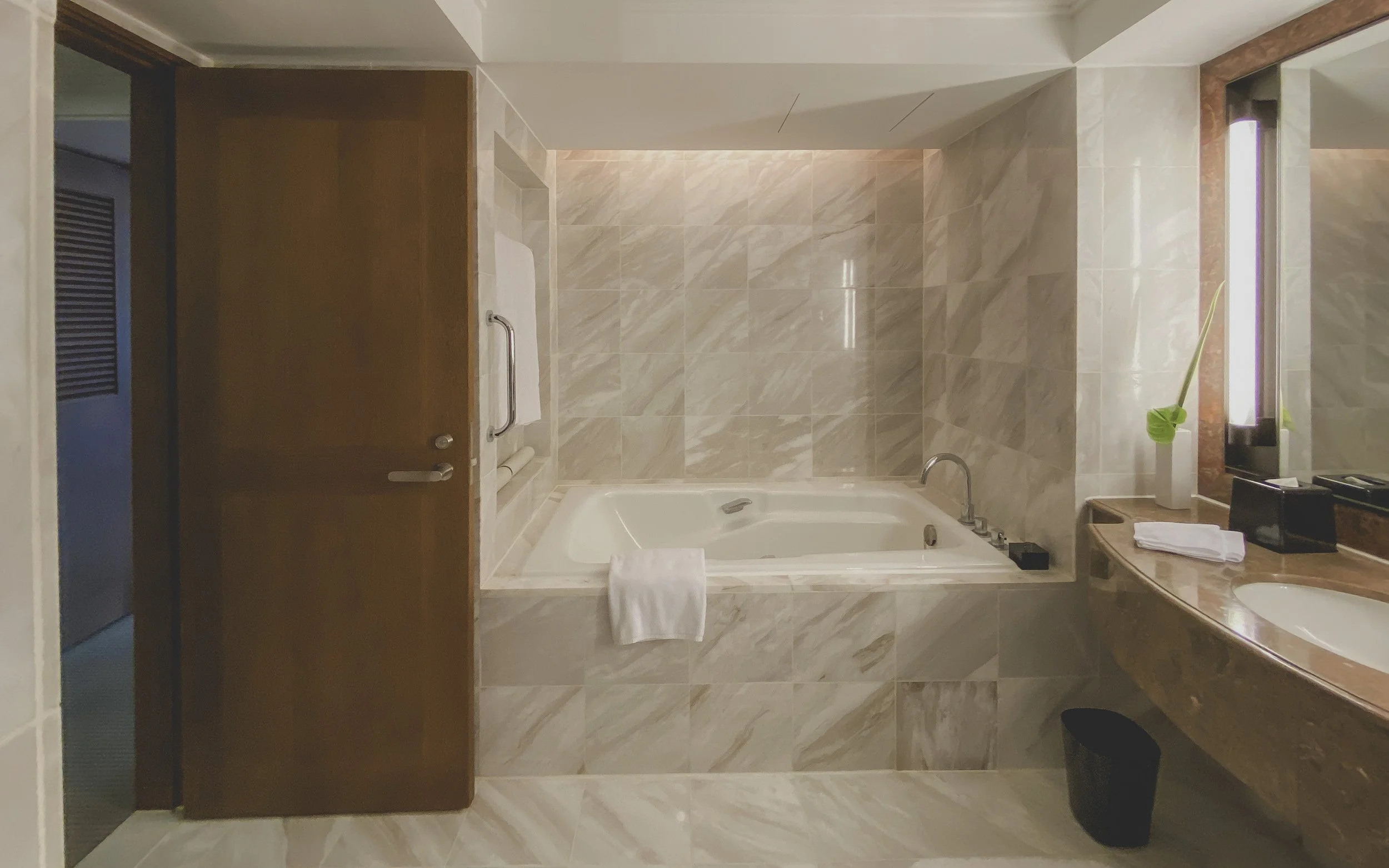 It features a deep-soaking tub and a separate walk-in shower equipped with both a true rainfall head and a handheld wand, all boasting excellent water pressure. You’ll find high-end Diptyque or Wellspring Spa amenities (depending on the floor), plush oversized towels, and a modern TOTO bidet. Thoughtful touches, like an abundance of complimentary bottled water tucked neatly by the vanity and a dedicated mirror lighting system, ensure the space is as functional for morning prep as it is for a midnight soak.