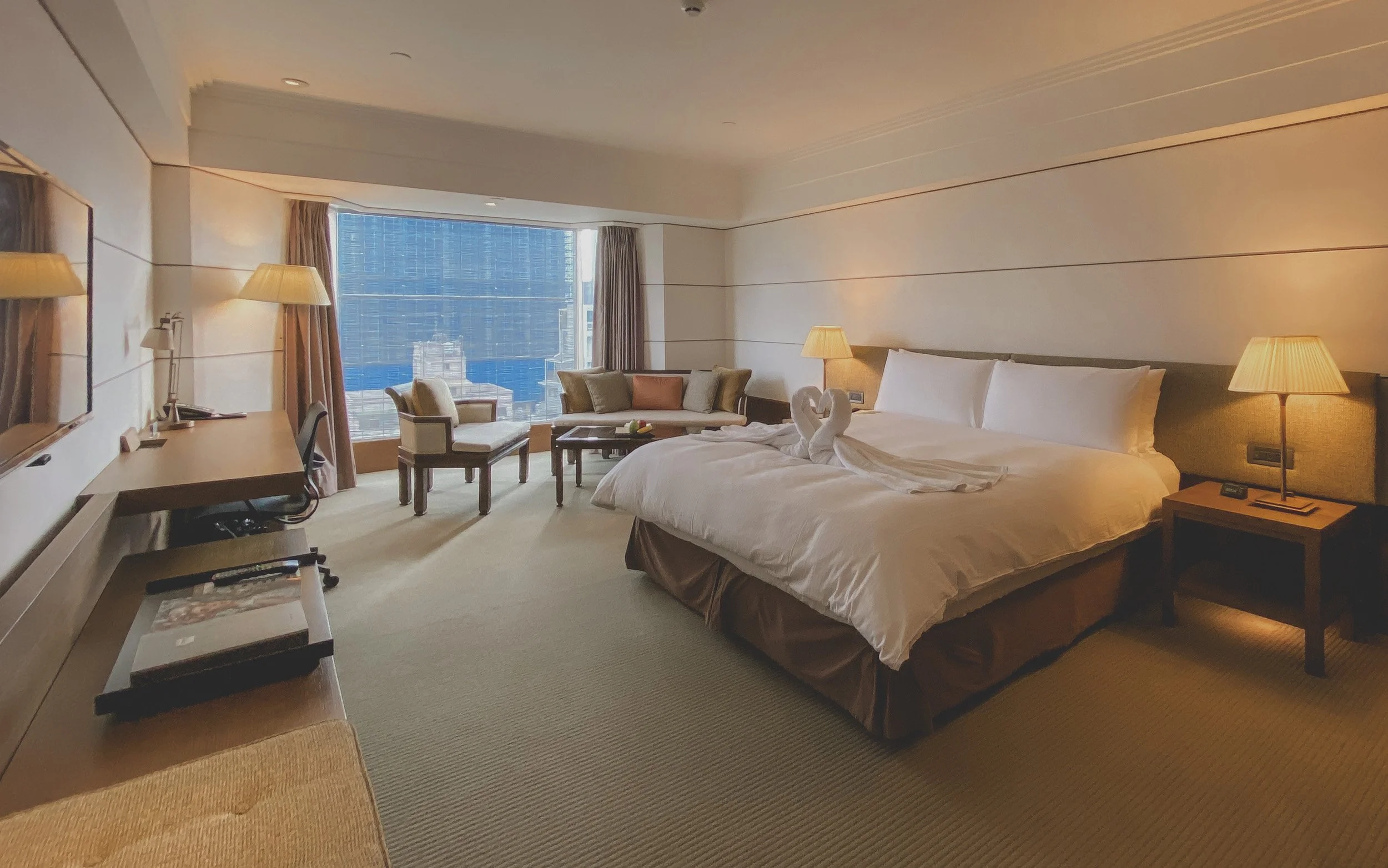 Upon entering my Premier Room at The Regent Taipei, you’re greeted with the bedroom, alongside the workstation and living room. The room was spacious and tastefully appointed, with a soothing color palette and elegant furnishings that created a welcoming ambiance. The large windows offered breathtaking views of Taipei's vibrant cityscape, allowing natural light to flood the room during the day. At the work desk, they supplied a Herman Miller Aeron chair, which is my personal favorite (as I have one at home as well). Outlets are easily within reach and the Wifi was sufficient.