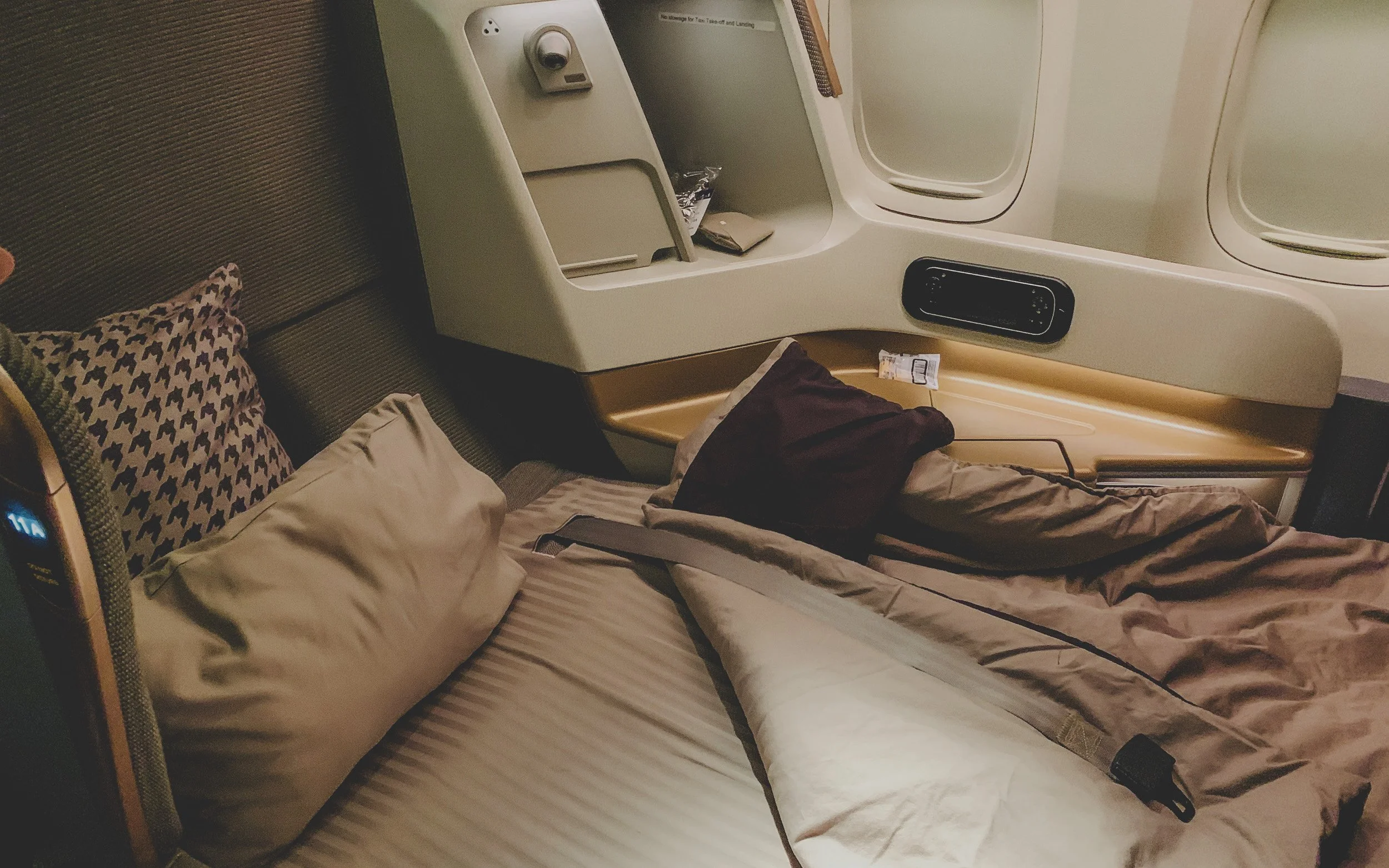 Beyond the dining, the crew’s proactive nature was most apparent when it came time to rest. While the "flip-down" bed mechanism on the A350 and 777 can be a bit cumbersome to handle alone, the attendants were always one step ahead, offering to set up the bed with the plush mattress topper, duvet, and full-sized pillows the moment I expressed a desire to sleep. This happened as I went to the bathroom to brush up, and lo and behold, a bed showed up! This "turn-down" service, often accompanied by a small bottle of water and an inquiry if I needed anything else before the cabin lights dimmed, added a layer of care that is rare in Business Class. It is this combination of high-level technical skill and intuitive hospitality that consistently makes the 15-hour trek across the Pacific a remarkably pleasant journey.