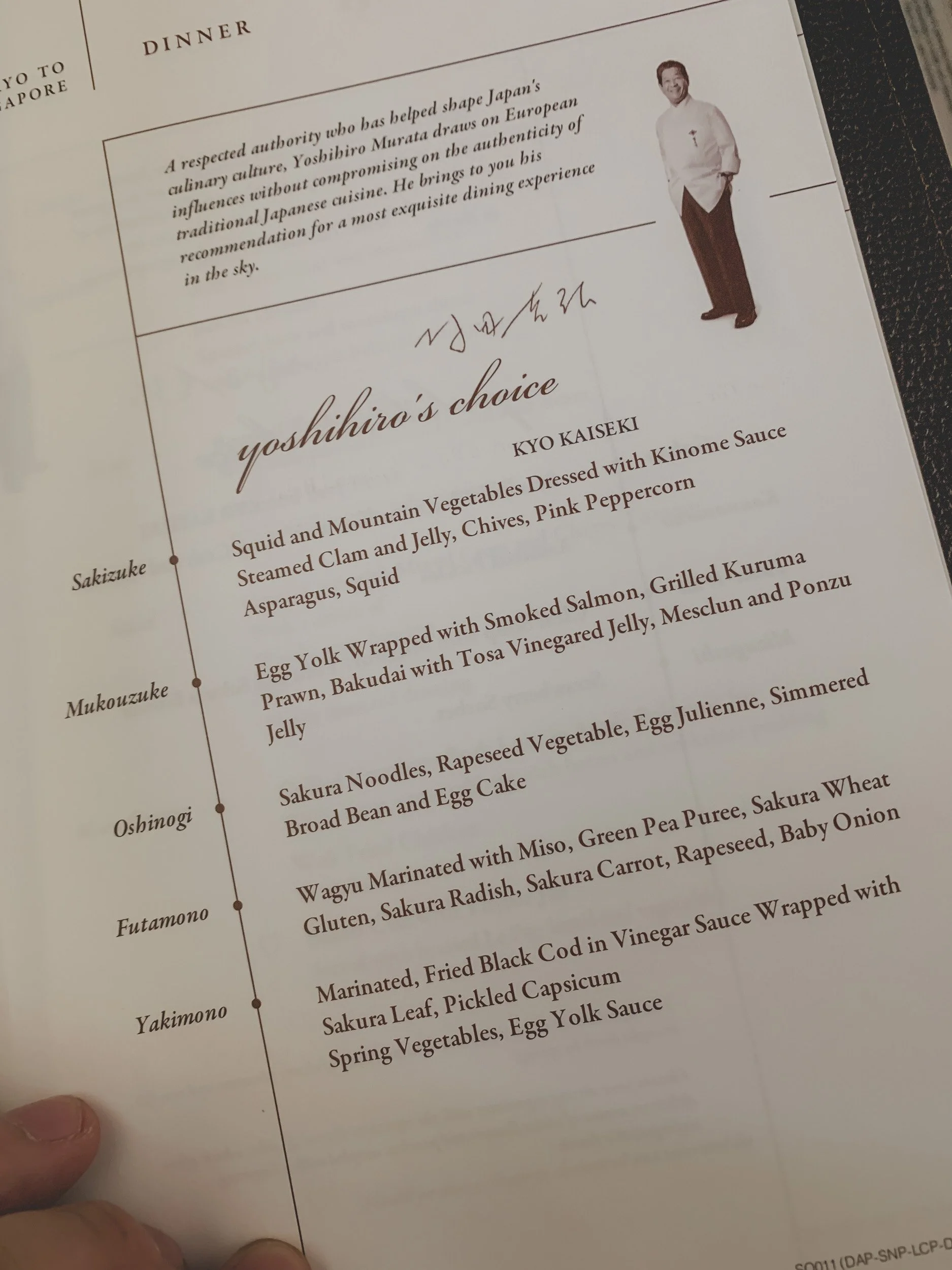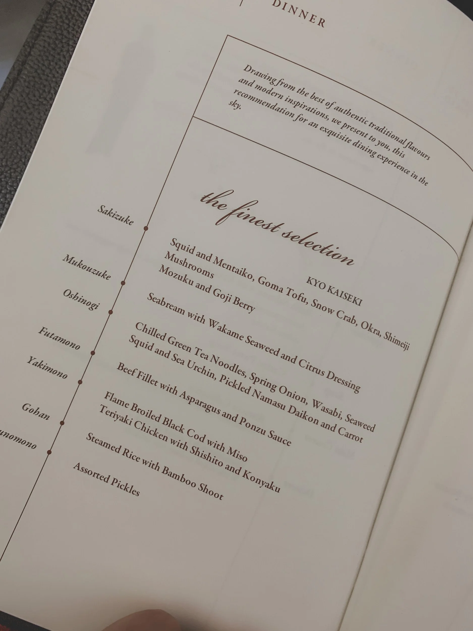 Dinner aboard Singapore Airlines flight SQ 12 (LAX–NRT) in First Class presents a refined dining sequence—start with a delicate amuse-bouche and seasonal hors d’oeuvre, then move into the Kyo Kaiseki option if selected. The Kyo Kaiseki is a composed, multi-course Japanese tasting that emphasizes seasonal ingredients and elegant presentation: chilled sashimi, a clear soup, simmered and grilled seasonal fish, and a light rice course with pickles, finished with a subtly sweet wagashi. Alternatives include classic Western plated mains (seared beef or seafood with rich jus and composed sides), a contemporary Singaporean-influenced option, or an à la carte selection from the Book the Cook menu; all dishes are served on fine tableware with paired wines and thoughtful palate cleansers between courses.