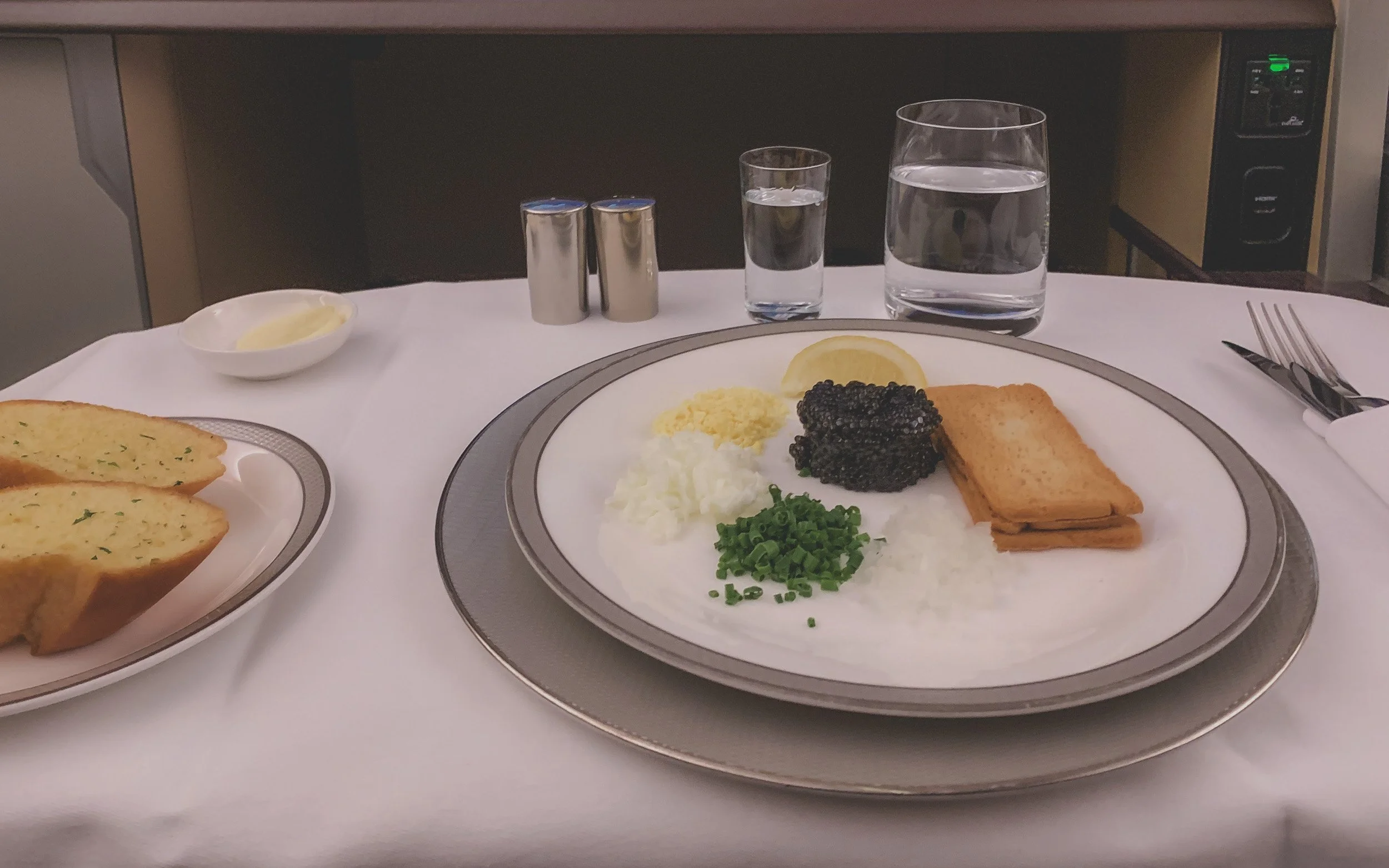 We were the only two first-class passengers on the Singapore Airlines LAX–NRT flight, which quickly turned the cabin into our private dining room: the crew presented the full a la carte menu as if it were a tasting menu, starting with generous servings of caviar and moving through all the champagne we could drink (and not pass out). Lobster thermidor arrived perfectly cooked and decadent, interspersed with other indulgences from the galley, and a parade of desserts—too many that I lost track—kept appearing as if by magic of the Chief Stewardess and her team. The service was unhurried and attentive, each course accompanied by thoughtful wine pairings and warm smiles, so every bite felt celebratory; between courses we lingered over top-ups of bubbles and traded recommendations for restaurants and hotels like old friends plotting an ideal itinerary.